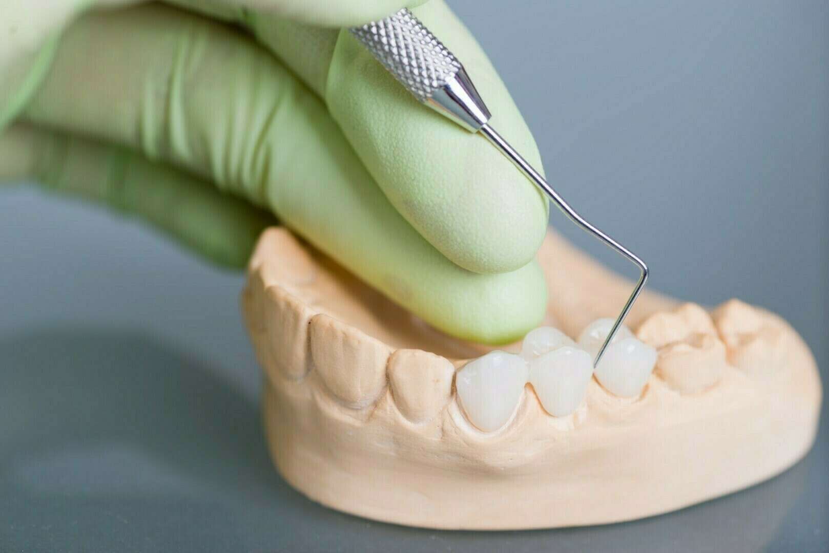 > En premier lieu, la dent est préparée et une couronne transitoire en résine est mise en place. En cas de dent dévitalisée et fortement délabrée, un tenon peut être placé dans la dent, soit directement, soit en passant par une empreinte de l’intérieur de la racine.